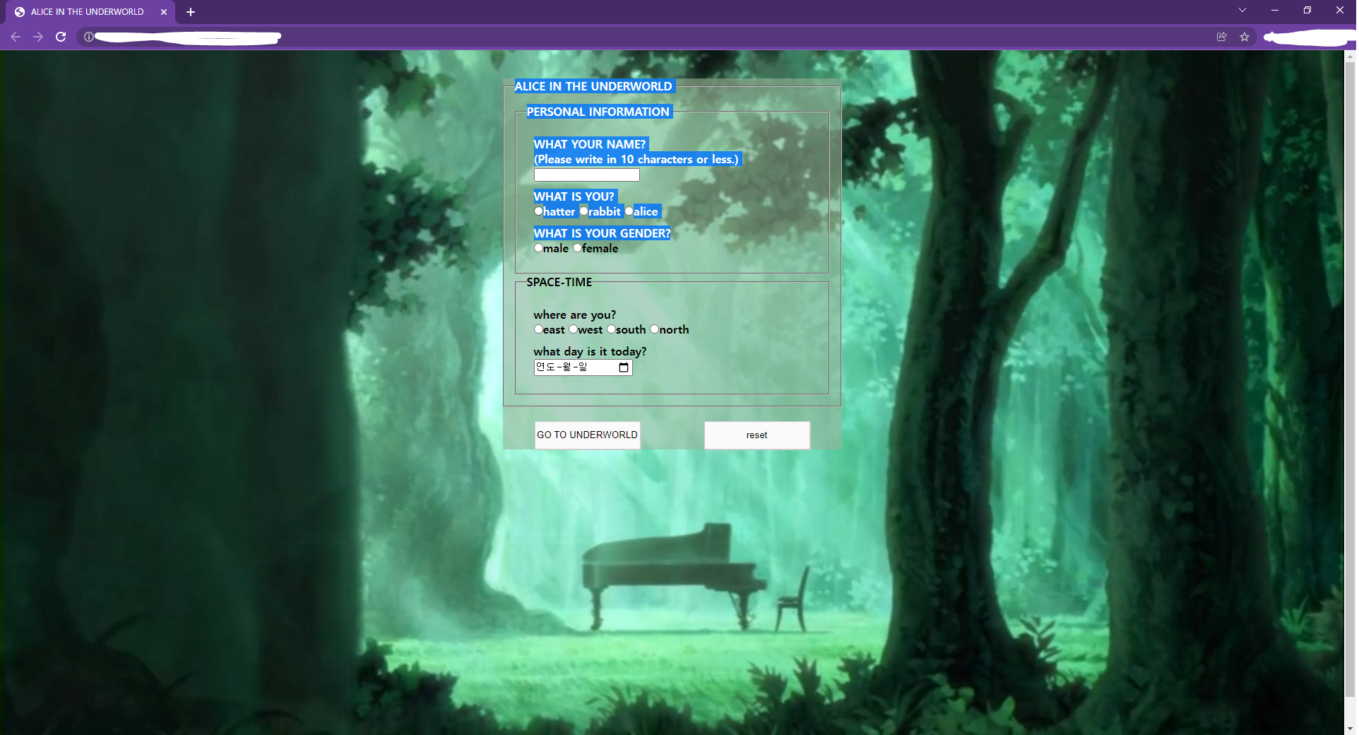 기본적인 것들을 사용하여 진짜 진짜 간단한 웹페이지라고 하기엔 부끄러운 무언가를 만들었다. 갑자기 이상한 나라의 앨리스가 생각나서 그냥 내키는 대로 주제를 이상한 나라의 앨리스로 잡았는데 지금 생각해보면 참 의식의 흐름대로 행동한것이 보인다. form 을 통해 설문지 비스무리 한것을 형성 하였고, 내부 사정으로 개인정보와 장소 시간을 정하도록 만들어 보았다. 처음엔 form 안에 form 을 넣어서 sumit 과 reset 버튼이 작동을 하지 않았는데 꽤나 지난후에야 form 안에 form 을 넣으면 안된다는것을 깨닭았다. 🤣🤣