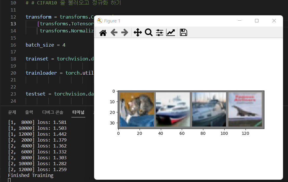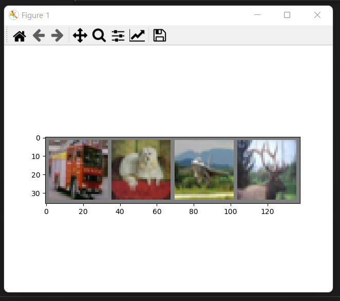 1.에서 불러온 CIFAR-10에서 이미지를 4개 정도 가져오는 실습 진행