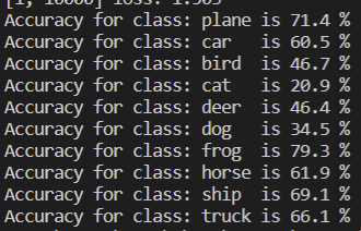 직접 신경망을 구성하고 data set CIFAR-10을 이용하여 tarining 과 test 과정을 진행해 보았는데, 본 과정을 거의 0부터 10까지 해본것은 처음이라 코드를 치고 결과를 확인하며 꽤나 즐거웠다.
