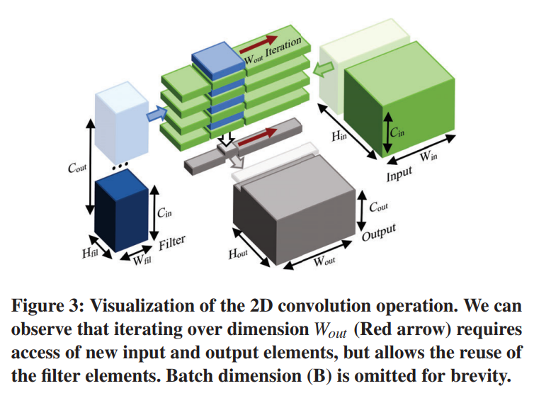 예를 들어, 그림 2에서 K 차원을 반복하면 동일한 출력 요소 C(i, j)를 재사용할 수 있는 반면 새로운 입력 및 필터 요소에 대한 액세스가 필요하다는 것을 알 수 있다. 따라서 차원 K는 출력 행렬의 재사용 차원이 되고 입력 및 필터 행렬의 액세스 차원이 됩니다. 같은 방식으로, 그림 3에서 dimension Wout을 반복하면 동일한 필터 요소를 재사용할 수 있는 동시에 새로운 입력 및 출력 요소에 대한 액세스가 필요하다는 것을 알 수 있습니다. 치수 Wout은 필터 텐서의 Reuse 차원일 수 있고, 입력 및 출력 텐서의 Access 차원일 수 있다.