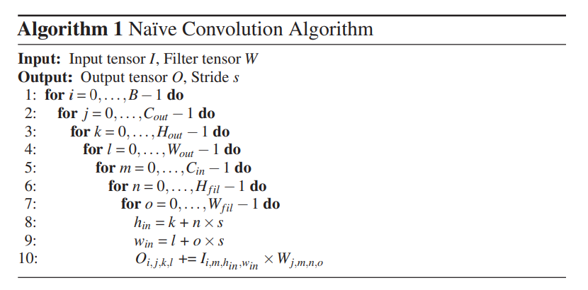 우리는 convolution tensor 를 Feature Map 이나 Kernel 대신 input, filter, output 으로 지칭할 것이다. 입력 및 출력 텐서 치수는 해당 텐서의 배치, 채널, 높이, 폭 치수에 해당하는 B, Cin, Hin, Win 및 B, Cout, Hout, Wout으로 각각 표시된다. 마찬가지로 필터 텐서 치수는 Cout, Cin, Hfil, Wfil로 표시된다. 컨볼루션 연산은 알고리즘 1과 같이 입력, 필터, 출력 텐서의 요소를 피연산자로 하여 7차원 이상의 루프에 대해 중첩된 MAC 연산으로 표현될 수 있다.