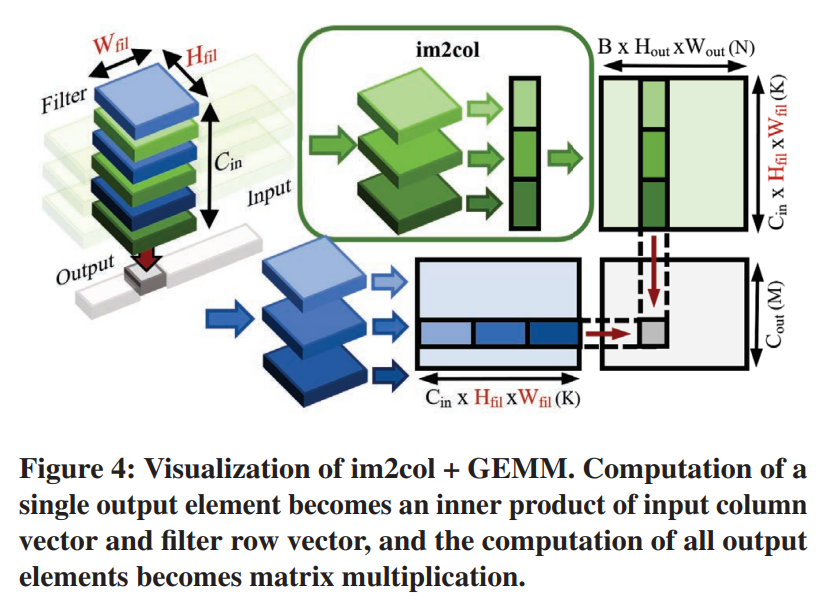 가장 널리 사용되는 접근 방식 중 하나는 im2col[5]이다. Im2col은 단일 출력 요소 계산에 필요한 모든 입력 요소를 C(in) ×H(fil) ×W(fil) 크기의 열 벡터로 평면화한다. 대응하는 평면화된 필터 행 벡터를 사용하여 단일 출력 요소의 계산은 이제 입력 열과 필터 행 벡터의 내적이다. 이것이 모든 C(out) × B × H(out) × W(out) 출력 요소에 대해 반복될 때 내적 계산의 결과 집합은 그림 4와 같이 행렬 곱셈의 형태를 취한다.