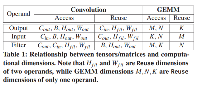 먼저 dimension 과 oprand 사이의 관계를 재사용 또는 액세스로 분류한다. 액세스 차원은 MAC 작업에서 주어진 operand 의 요소를 결정하는 데 관련된 dimension이다. 반대로 재사용 dimension 은 관련되지 않은 dimension 이다.