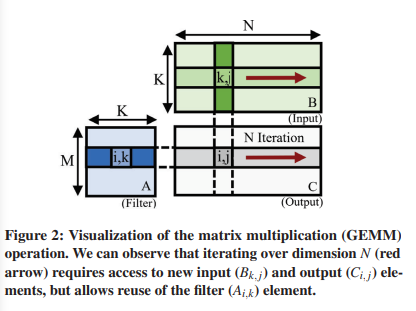 GEMM 연산은 M, N, K의 3가지 계산 차원에 대한 중첩된 루프에서 multiply-accumulate (MAC) 연산으로 표현된다.i, j, k는 각각 M, N, K 위의 반복자이고, A(i,k), B(k,j), C(i,j)는 각각 행렬 A(M×K), B(K×N), C(M×N)의 원소이다. 이 연산은 두 벡터 집합 사이의 독립적인 내부 곱셈 계산 집합으로 이해될 수 있으며, 이는 병렬화와 데이터 재사용을 위한 큰 기회를 제공한다. 예를 들어, Figure 2에서 각 출력 요소 C(i, j)가 열 벡터 B(:, j)와 행 벡터 A(i,:)의 내부 곱으로 계산되는 것을 관찰할 수 있다. 다른 연산에는 출력 요소가 필요하지 않기 때문에 여러 출력 요소를 병렬로 계산할 수 있다. N차원에 걸쳐 출력 요소의 계산을 병렬화하면, 행 벡터 A(i,:)가 계산 간에 공유되어 병렬 계산 단위 간에 데이터를 재사용할 수 있다. 데이터 재사용은 내적 차원 K에 대해 출력 요소 C(i,k)를 재사용함으로써 단일 계산 단위 내에서 존재한다. 서로 다른 피연산자 행렬과 계산 차원에 걸쳐 많은 양의 병렬화 및 데이터 재사용 기회가 존재한다는 것을 쉽게 관찰할 수 있다. 기존 GEMM 계산 연구[8, 13, 14, 27, 41]와 라이브러리[21, 33, 50]는 기본 하드웨어의 메모리 계층 및 벡터 처리 기능의 가장 효율적인 사용을 용이하게 하는 방식으로 작업을 신중하게 분할하고 스케줄링함으로써 이러한 기회를 활용한다.