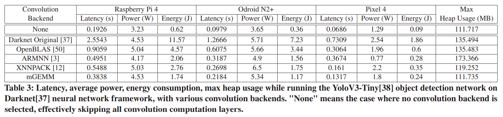 표 3은 테스트 장치에서 실행되는 5가지 다른 컨볼루션 백엔드의 YoloV3-Tiny 객체 감지 성능을 보여준다. mGEMM은 각 장치의 두 번째로 빠른 솔루션과 비교하여 대기 시간에서 22%에서 29%의 속도 향상을 달성하며, 이는 또한 유사한 비율로 에너지 소비를 줄이는 동시에 모든 컨볼루션 레이어를 건너뛰어 측정한 이론적 최소값보다 0.018MB만 더 많이 사용한다.