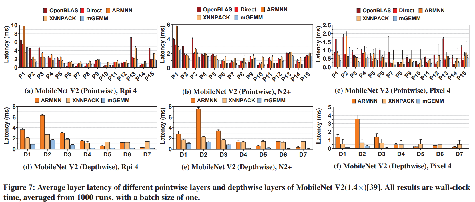 5.2.2 Depthwise and Pointwise Convolutions. 그림 7은 MobileNet V2(1.4x)의 포인트별 및 깊이별 레이어에서 기존 GEMM 기반 솔루션과 비교하여 mGEMM 컨볼루션 커널의 레이턴시를 보여준다. im2col + GEMM[5] 및 direct 컨볼루션 방법[52]은 깊이별 컨볼루션 계산을 위한 접근 방식을 지정하지 않기 때문에 깊이별 컨볼루션 테스트에 포함시키지 않았다.