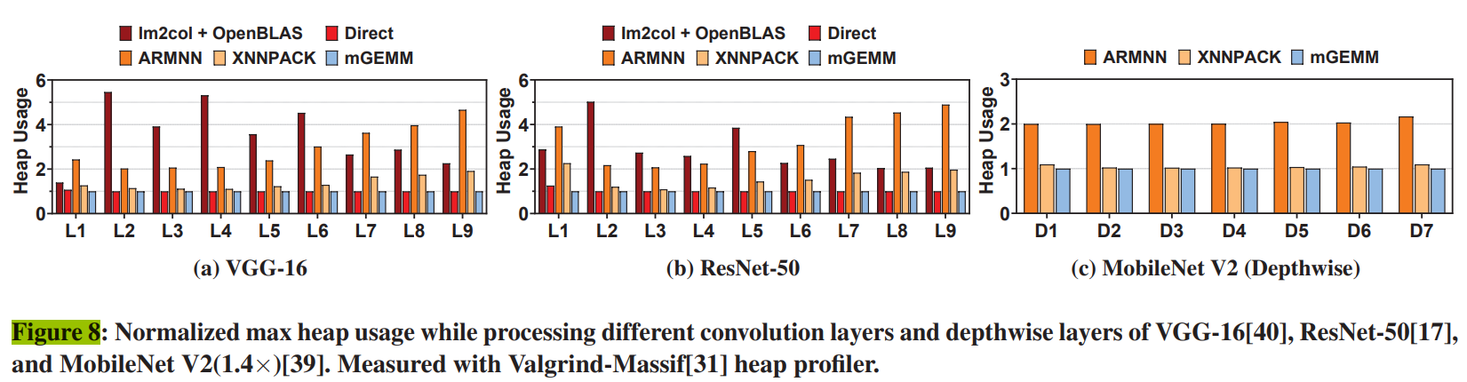 5.2.3 Memory Usage per Layer. 그림 8은 VGG-16[40], ResNet-50[17]의 non pointwise 레이어와 MobileNet V2(1.4×)[39]의 depthwise 레이어의 정규화된 최대 힙 메모리 사용량을 보여준다. Valgrind-Massif[31]는 테스트 프로그램의 힙 할당을 기록하여 작동하므로 출력은 장치 독립적이다. 각 솔루션의 최대 힙 사용량을 각 계층의 입력, 출력 및 필터 텐서를 저장하는 데 필요한 이론적 최소 메모리 공간으로 정규화했다. 추가 메모리 공간 없이 직접 계산할 수 있는 pointwise 레이어는 포함하지 않았다. 우리의 mGEMM 커널과 direct 컨볼루션 방법[52]은 메모리 오버헤드가 없는 솔루션이므로 추가 메모리 공간이 필요하지 않다. 반면 im2col + OpenBLAS와 ARMNN은 최소 메모리 풋프린트에 1.4배에서 5.5배, 더 최적화된 XNNPACK은 1.1배에서 2배이다.