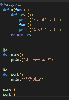decorator 를 이해하기 위해 예제 코드이다. 먼저 x 라는 함수를 정의한 후 name, work 라는 함수에 decorator @x 를 사용하여 실행을 진행 하였다.