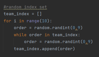 다음으로 random 으로 indexing 을 해준다. for loop를 사용하여 순서를 random.randint 를 사용하여 random 으로 0~9까지의 수를 넣어준다. 그리고 order 가 team_index 에 존재한다면 다른 수를 넣어야 하기 때문에 while 문을 통해서 유무를 판별한다. 있다면 없을때 team_index 에 없을 때까지 random 값을 설정한다. while 문을 빠져 나온다면 team_index 에 append 해준다.