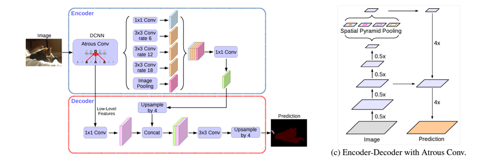 본 모델의 주요 특징은 Atrous Conv 를 사용한다는점, Pyramid Pooling 을 사용한다는 점, Encoder-Decoder 형태를 가진다는 점이다.