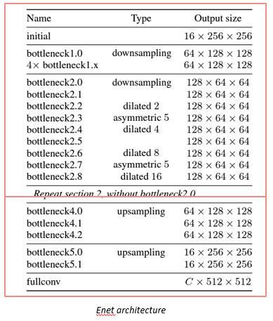 Enet 은 인코더 디코더 기반의 모델이라 할 수 있다. 이는 U-Net 과 비슷한 구조를 갖지만, shortcut 이 존재하지 않는 차이점이 보인다.