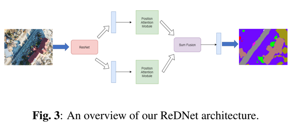 ReDNet 은 ResNet 기반의 Dual attention 방법을 사용했으며, attention module 을 직접 설계하여 사용한다. 이는 PAM 으로 Position Attention Module 의 약자이다. 또한 dataset 으로 HRUD ( High Resolution UAV Dataset ) 을 사용한다. 본 dataset 은 위에서 언급했던 저자의 이전 연구와 관련된 dataset 이다.