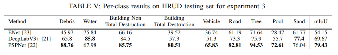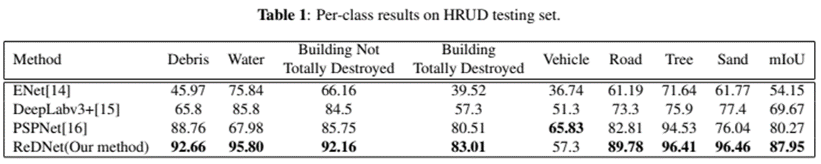 위 previous research 에서 Full paper 를 확인 할 수 있으며, IEEE Big Data 2020 에 publish 된 연구이다. 저자는 자연재해 dataset 을 제안하며 최근 주요한 sementic segmentation model 들을 통해 dataset 을 평가하는 실험을 진행한다. 실험 결과는 아래와 같다.