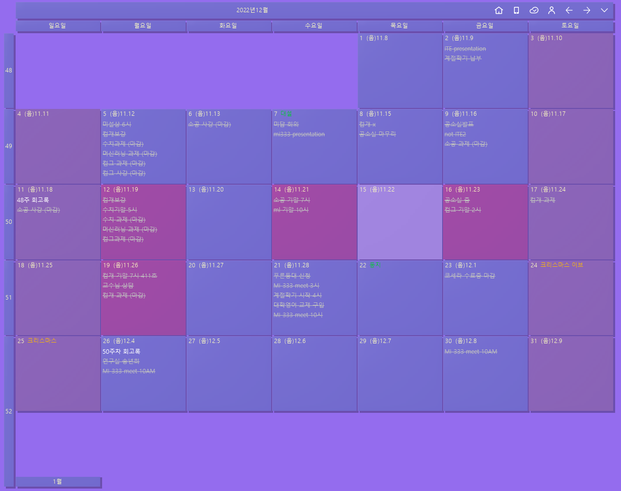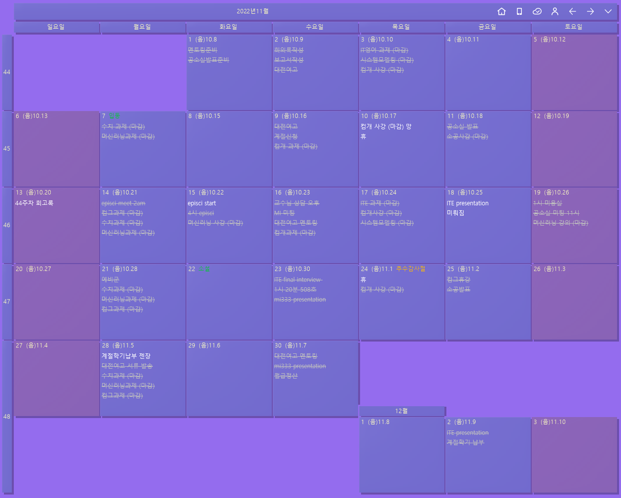 잘 보일지는 모르겠으나 거의 꽉꽉 채워진 나의 캘린더이고, 꽤나...엄청.....많이 바쁜...? 하루하루를 보냈다는 것을 알 수 있다.
