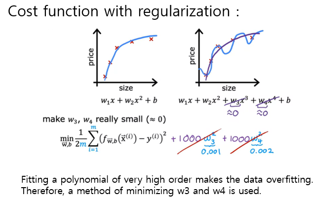 예를 들어 w3과 w4에 비용 함수의 매우 큰 값을 곱해버리면 cost function 에서 높은 cost 가 발생할 것이고,