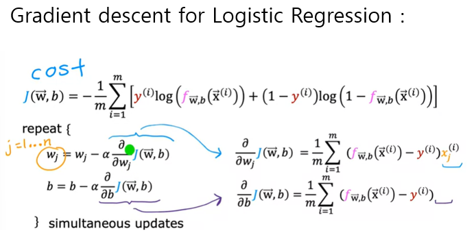 cost function을 최소화하는 매개변수를 찾기 위해 로지스틱 회귀도 경사하강법을 사용한다.