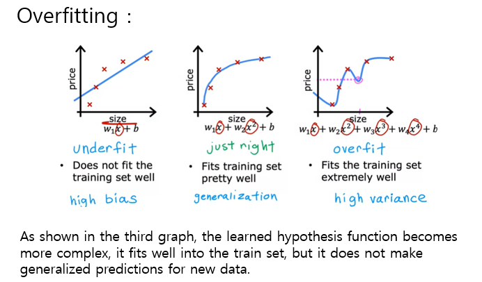 Overfitting은 세 번째 그래프에서 보듯이, 학습된 가설 함수가 복잡해질수록 train set에 잘 맞지만,