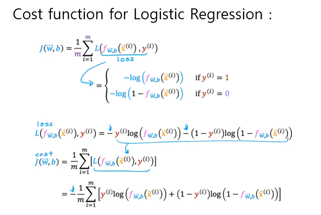 로지스틱 회귀에서 w와 b의 값을 구하는 방법은 선형회귀에서 사용한 cost function의 format을 사용한다.