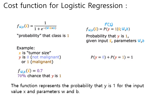 따라서 sigmoid 함수는 입력 값 x와 매개변수 w 및 b에 대해 y가 1일 확률을 나타낸다고 할 수 있다.